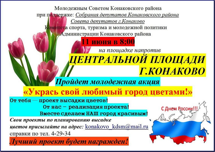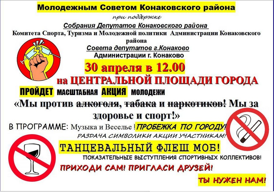 30 апреля состоялась долгожданная акция, подготовленная Молодежным Советом при Главе Конаковского района: «Мы против табака, алкоголя и наркотиков. Мы за здоровье и спорт!». В ней приняли участие различные молодежные объединения города, спортсмены и присоединившиеся прохожие, среди которых были уважаемые ветераны Акция началась с раздачи символики, в виде наклеек с лозунгами, такими как «Выбирай спорт», «Хватит бухать» и другими. После вступительного слова и небольшой разминки в сопровождении сотрудников ГИБДД колонна участников совершила пробег по центральной улице города. По завершении пробега, немного отдышавшиеся участники, присоединились к танцевальному флешмобу, проводящемуся на центральной площади. К моменту начала флешмоба на площади собралось большое количество зрителей, они с радостью присоединились к массовому танцу. В конце флешмоба на фоне баннера с лозунгом «Стоп алкоголь! Долой табак! Наркотикам – Нет!» было сделано общее фото участников. Затем все желающие могли посмотреть на выступление танцевальной группы «Брейк-Дэнс» из Конаково, а также послушать замечательные песни в исполнении местных музыкантов, называющих себя «SPS». Все участники получили брошюры, рассказывающие о вреде алкоголя, табака, наркотиков. Так как мероприятие проходило в преддверии дня Победы, была организована раздача Георгиевских ленточек, которые разлетелись в считанные секунды. Отголоски акции слышались и по ее завершении, то на улицах города то в магазинах, добрым словом ее обсуждали жители.