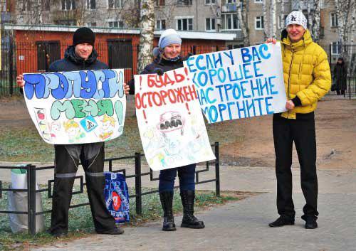 11 ноября в воскресенье в Конаково прошла очередная акция Молодёжного Совета. В этот раз конаковские активисты решили обратить внимание водителей и пешеходов на опасности, подстерегающие их на трассах в осеннее-зимний период. При минусовой температуре кое-где на дорогах образуется гололёд, тормозной путь дорожного транспорта сокращается. Это нужно помнить не только автомобилистам, но и пешеходам. «Будь осторожен!», «Пропустите пешехода, если хотите спасти жизнь!», «Пропусти меня!» - призывали и предупреждали плакаты, которые ребята принесли с собой. Акция была направлена на сокращение количества ДТП в городе, которое неуклонно повышается при неблагоприятной обстановке на дорогах. Был и такой плакат, который был призван не учить, а скорее развеселить водителей: «Если у Вас хорошее настроение – моргните». И водители моргали фарами, сигналили и улыбались. Яркие плакаты, весёлые лица молодых людей – всё это явно поднимало настроение у прохожих и водителей в этот прохладный воскресный день. И главное, ни одного ДТП во время акции не произошло.