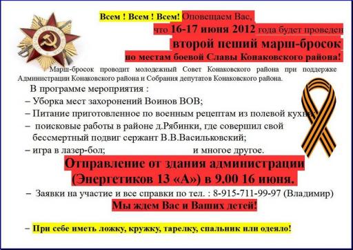 Второй пеший марш-бросок по местам боевой Славы Конаковского района.В этом году во второй раз молодежным Советом Конаковского района и военно-патриотическим клубом «Звезда» был осуществлен пеший марш-бросок. Целью данного мероприятия является развитие военно-патриотического воспитания, развитие юноармейского движения и привлечение молодежи к поисковой деятельности.Ранним утром 16 июня группа активистов МолСовета с участниками центра «Звезда» под руководством председателя Валерия Петровича Гореликова «высадилась» на прекрасный берег реки Волга в районе деревни Вараксино. Несмотря на пасмурную погоду, сразу закипела работа. За считанные минуты был разбит лагерь, который в дальнейшем помогал укрыться от дождя. Марш-бросок начался с того, что ребята были разбиты на два поисковых отряда. Один отряд направился на «разведку» территории, где проходила линия обороны немецких войск в 1941 году, второй отправился на место возможного захоронения советских воинов. Два часа кипела работа, и остановить ее смог только ливень. Результатами поисковой деятельности отрядов стали патроны и гильзы, использовавшиеся во время ВОВ. После того, как участники немного обсохли, на территории заброшенной птицефабрики Завидово их ждал настоящий сюрприз, который осуществился благодаря депутату Завидовского поселения Ленмару Владимировичу Тимофееву. Этим сюрпризом стала военная ролевая игра «Лазертаг». Смысл игры заключается в том, что каждому участнику выдается комплект оборудования из шлема и лазерной винтовки. Поражая из такой винтовки противника, шлем начинает вибрировать и издавать звуки. Происходящее действие похоже на компьютерную игру, но все происходит в реальном времени и в конкретном месте. Ребята разделились вначале на три команды для того, чтобы выяснить, кто будет играть в большой финальной игре. Определив победителей, началась квест игра «С.Т.А.Л.К.Е.Р.», где помимо защиты базы, нужно было искать квест-предметы и выполнять различные задания. О своих ощущениях от игры рассказывает председатель МолСовета Денис Клементьев: - «Ощущения от игры трудно передать словами, это надо прочувствовать на себе, окунуться в атмосферу командной борьбы. А вообще, это азарт, когда из- за каждого угла может выскочить противник, пытаешься сделать все как можно быстрее и незаметнее. Также это ощущение командного духа, несмотря на то, что в команде были ребята и девчонки, многих из которых я видел впервые, нам удалось быстро сплотиться, каждый четко выполнял указания и внес свой вклад в победу. После начала игры, ты попадаешь в "другой мир", где есть только цель, задача, которую тебе и твоим соратникам необходимо выполнить, время пролетает на одном дыхании, кажется, что прошло всего пара минут, а на самом деле пролетел час и не один. В общем, игра очень понравилась, хочется повторить наши баталии, и снова схлестнуться в очередном квесте».Изрядно повеселившись, команды на катере отправились в лагерь, где уже была приготовлена гречневая каша по армейскому рецепт, у приготовленная на настоящей полевой кухне. Вечером погода разошлась, но невзирая на это, подростки не достигшие 18 лет, выехали домой на автобусе. Более старшие остались на ночевку в предвкушении радиотрансляции матча «Евро -2012»- Россия-Греция. Все готовились к победе нашей команды но, но итогом с