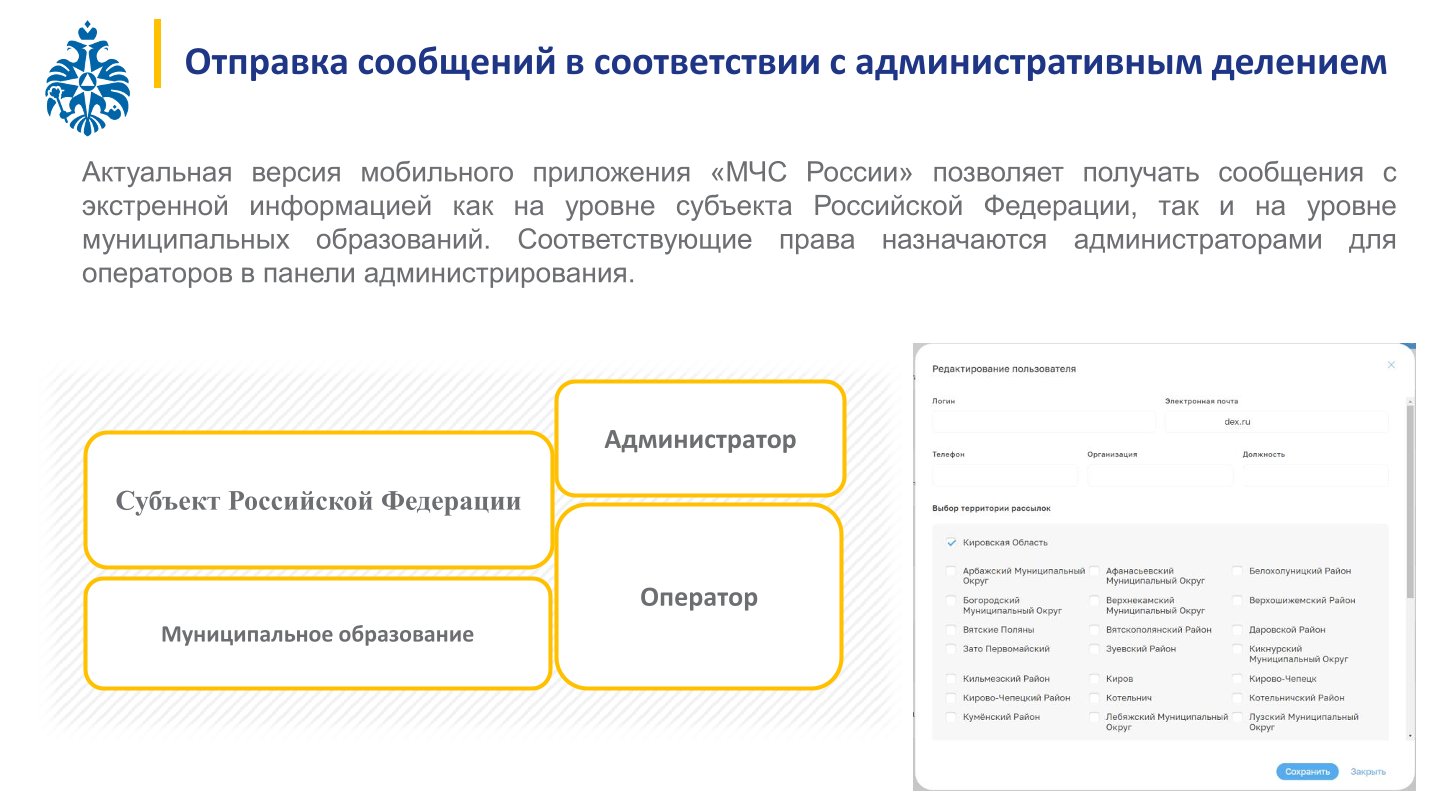 В приложении есть привязка по геолокации к субъекту Российской Федерации, что даёт возможность быть в курсе событий региона, связанных с МЧС России, и адресно получать экстренные предупреждения посредством всплывающих сообщений.