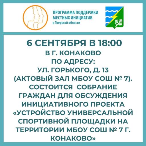 Инициативная группа, созданная для реализации инициативного проекта «Устройство универсальной спортивной площадки на территории МБОУ СОШ № 7 г. Конаково» приглашает вас на собрание граждан в формате общешкольного родительского собрания-презентации, которое состоится 6 сентября 2024 года в 18:00.