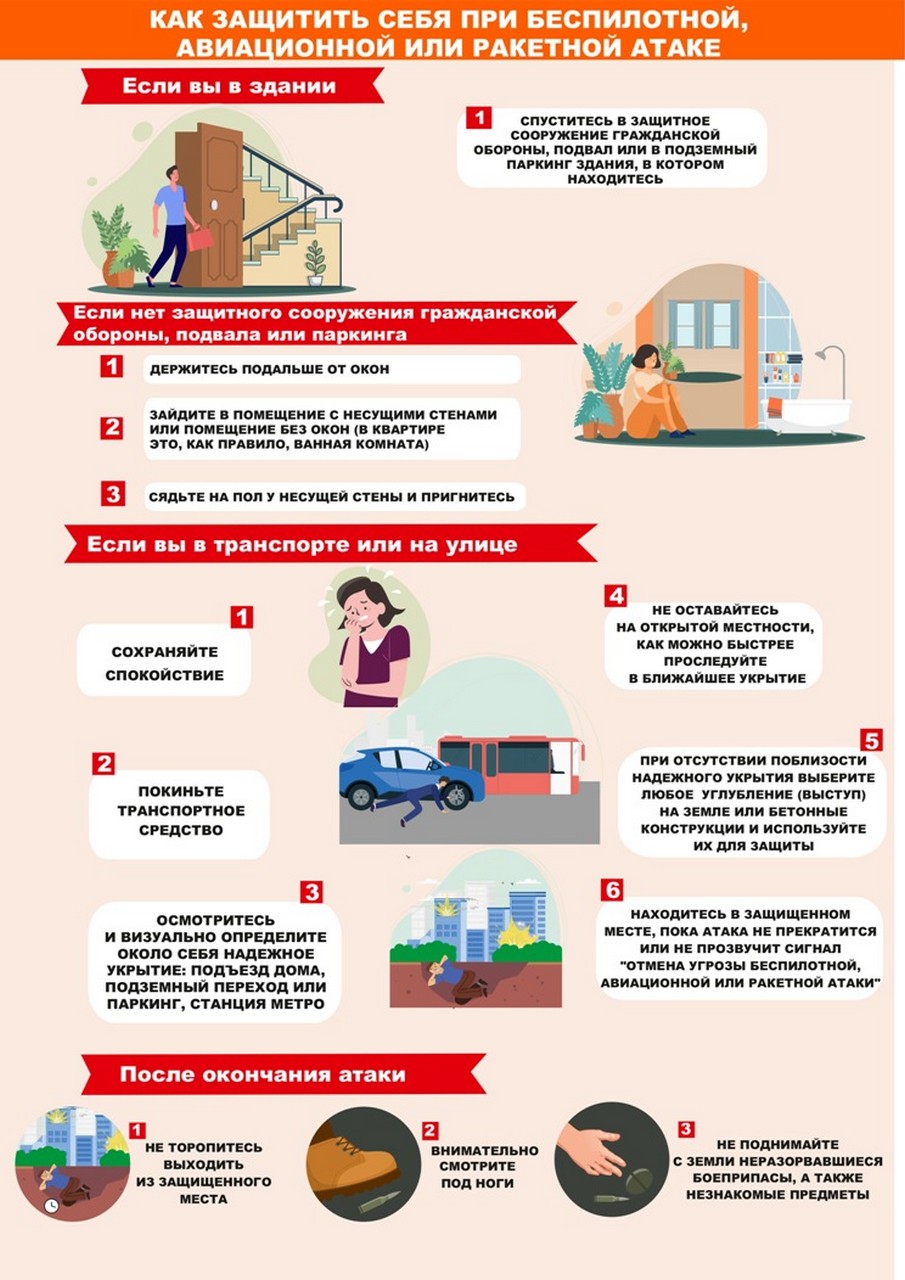 Предлагаем вам ознакомиться с памятками по действиям населения при возникновении опасности беспилотной, авиационной или ракетной атаки, катастрофического затопления, а также радиационного (химического) заражения.