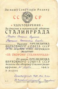 В феврале этого года наша страна отмечала семидесятилетие Сталинградского сражения. По телевидению много говорили о значении Сталинградской битвы. Я услышала, что для фашистской Германии поражение в этой битве стало ужасной трагедией, никто из фашистов не ожидал столь мощного отпора. Там, под Сталинградом, наш народ собрал все силы для решающего удара. Там был мой прадед, он часть истории моей страны, моей Родины. В народных былинах говорится о богатырях, защищающих родную землю. Солдаты, прошедшие Отечественную войну, тоже богатыри. Они смогли защитить своё Отечество, свои семьи. Мой прадед тоже богатырь земли русской, я благодарна ему за то, что он сражался за меня, терял своих боевых товарищей, видел ужас войны, но даже среди такого кошмара остался человеком. За Сталинградскую битву он был награждён медалью «За оборону Сталинграда». Удостоверение к медали храниться у нас дома, как священная реликвия. Этот документ был в гимнастерке моего прадеда, прошел с ним через всю войну. Я часто рассматриваю этот листок, который был вручен моему прадеду в августе 1943 года. Как все происходило – не знаю, могу только представлять… Может быть, награды вручали торжественно, перед строем, а может, в промежутке между боями.
