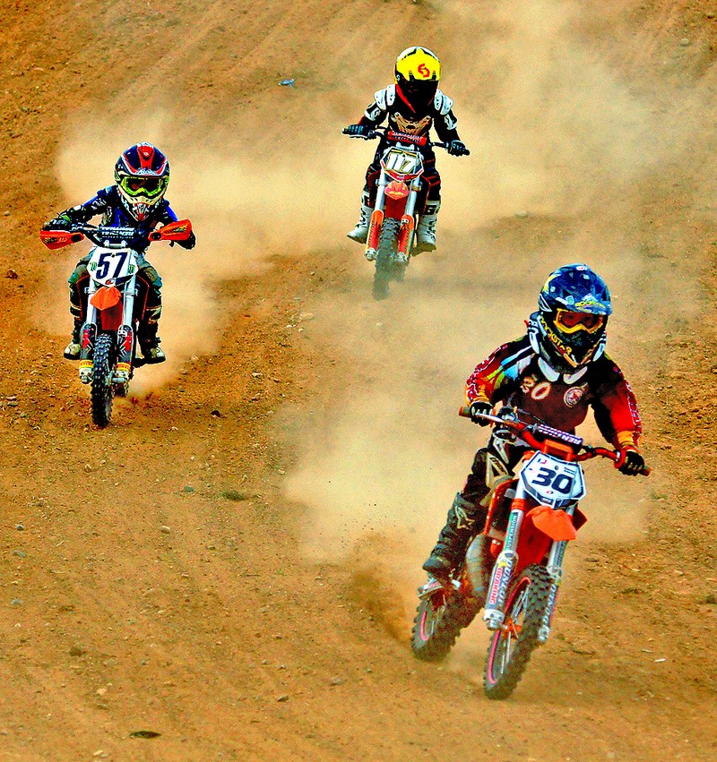 И вот дан старт. Сначала к финишу устремляются самые юные мотогонщики, по возрасту - начальная школа. Их «полтиннички», приземистые, как ишачки, тем не менее, развивают совсем не детскую скорость. Семь минут плюс 1 круг – вот регламент гонок для самых маленьких. Затем стартуют ребята постарше, у них лимит уже – 10 минут и 2 круга. Потом на старт выходят подростки, юноши и так – до взрослых и ветеранов. У них уже и техника мощнее и летают они на трамплинах выше и дальше. Погода стоит сухая, вся трасса окутана пылью, она везде – на зубах, на одежде и на фотоаппарате корреспондента. Даже робкий дождик не смог ее прибить…