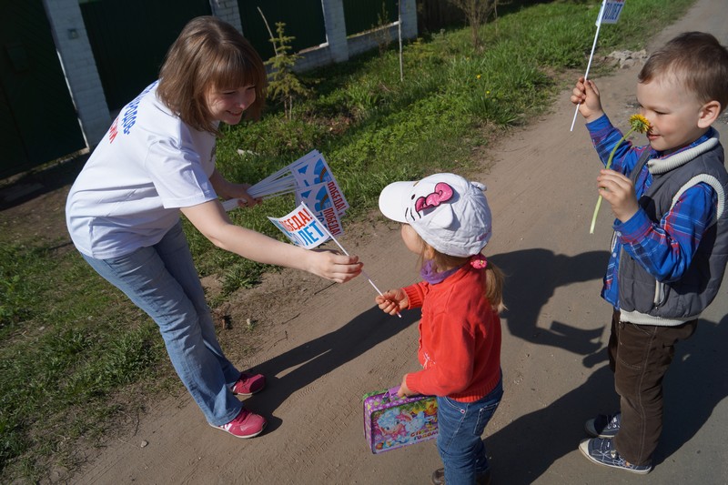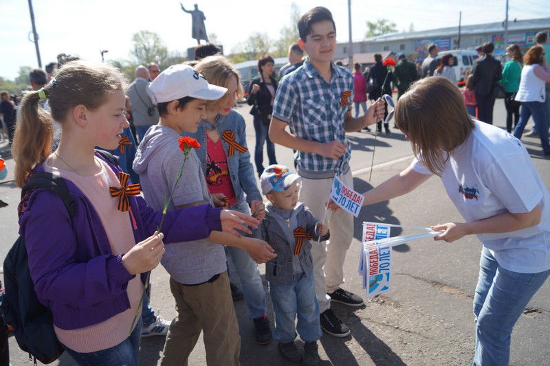 9 мая на улицах г. Конаково волонтеры молодежного центра «Иволга» совместно с участниками проекта «Единство», руководитель Кира Петранкина, поздравляли жителей и гостей города с 70-летием Великой Победы. Всем желающим раздавались «Георгиевские ленточки», а также флажки с символикой праздника. Кроме того, с 3 по 12 мая на автостанции города Конаково члены волонтерского корпуса 70-летия Победы в Великой Отечественной войне проводили акцию помощи ветеранам и пожилым людям. Участниками акции стали более 50 ветеранов и пожилых людей. На протяжении этих дней ребята помогали переносить тяжелые сумки и садиться в автобусы всем нуждающимся.