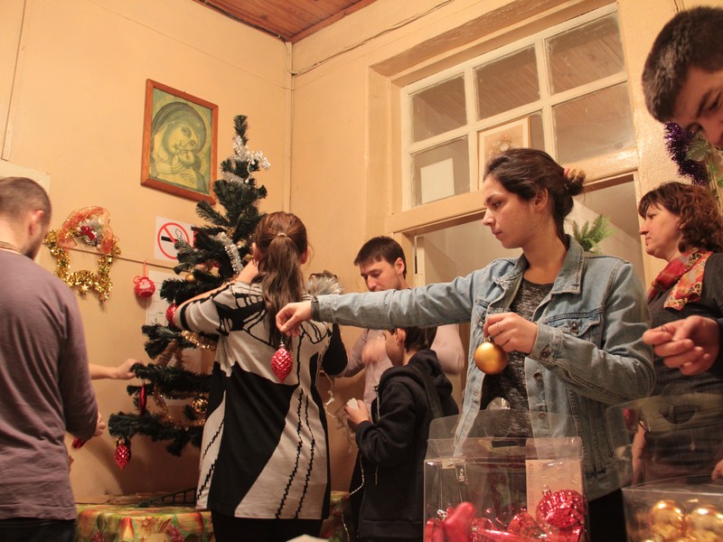 Пока же дизайнер помог хозяевам и гостям украсить Дом милосердия к новогоднему торжеству — дети и пожилые люди красиво развесили гирлянды, поставили елку и украсили ее игрушками (которые купили и привезли специально для этого случая). К акции помощи Дому милосердия подключились ребята из детского проекта «Найди себя». С утра они поехали в «Икею», где продавали новогодние открытки собственного изготовления, а на вырученные деньги по списку покупали все необходимое для стариков из Городни. Недостающие деньги добавили предприниматели — участники проекта. В результате в Городню отправился целый караван машин, который вез мебель (большой кожаный диван), коврики, новогодние подарки, и, конечно, елку!
