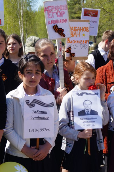 В этом году необычно выглядели учащиеся школ района. Все они стояли на площади перед монументом с самодельными транспарантами с фотографиями их прадедов и родственников.