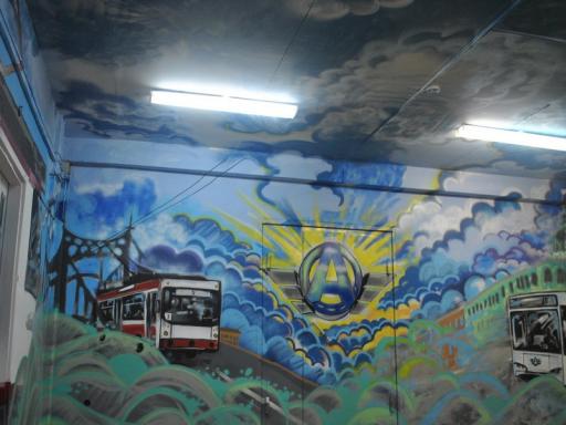 «Данный холл является «входными воротами» для посетителей и работников администрации нашего предприятия. Помещение долгое время имеет неприглядный вид из-за множества разномастных дверей и сетей наружных коммуникаций на стенах. Мы обсуждали в коллективе как привести его в привлекательное состояние, но стандартные решения были очень дорогостоящими – обшивка, выравнивание и покраска стен, замена дверей и т.д. В итоге возникла идея, что преобразить такое помещение можно с помощью граффити, - поделился директор предприятия Артур Вячеславович Сычёв, - На нашу просьбу о помощи, размещённую в группе «Транспорт Твери», практически сразу откликнулся художник из г. Конаково Илья Викулин. Самоотверженно и безвозмездно Илья при активном участии одного из наших сотрудников Кирилла Булычева за три дня с пятницы по воскресенье разработали концепцию оформления и реализовали её.