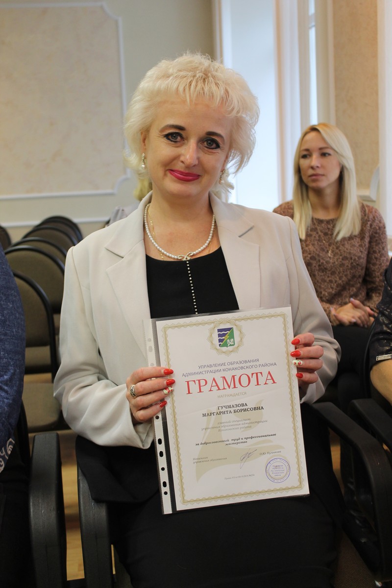 Грамотой Управления образования администрации Конаковского района за добросовестный труд и профессиональное мастерство награждена Маргарита Борисовна Гучмазова — главный специалист Управления образования администрации Конаковского района.