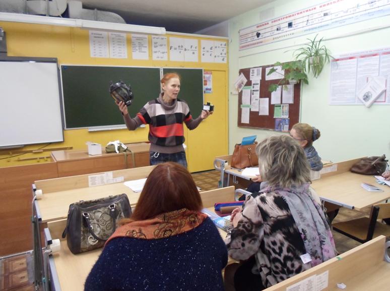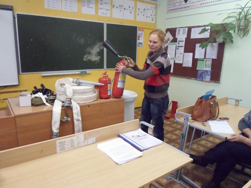 Преподаватель ОБЖ Назаренкова Лариса Викентьевна напомнила о правильных действиях при возникновении пожаров, эксплуатации средств индивидуальной защиты, а также разъяснила требования пожарной безопасности. Затем педагоги школы смогли потренироваться использовать огнетушитель, правильно одевать противогаз.