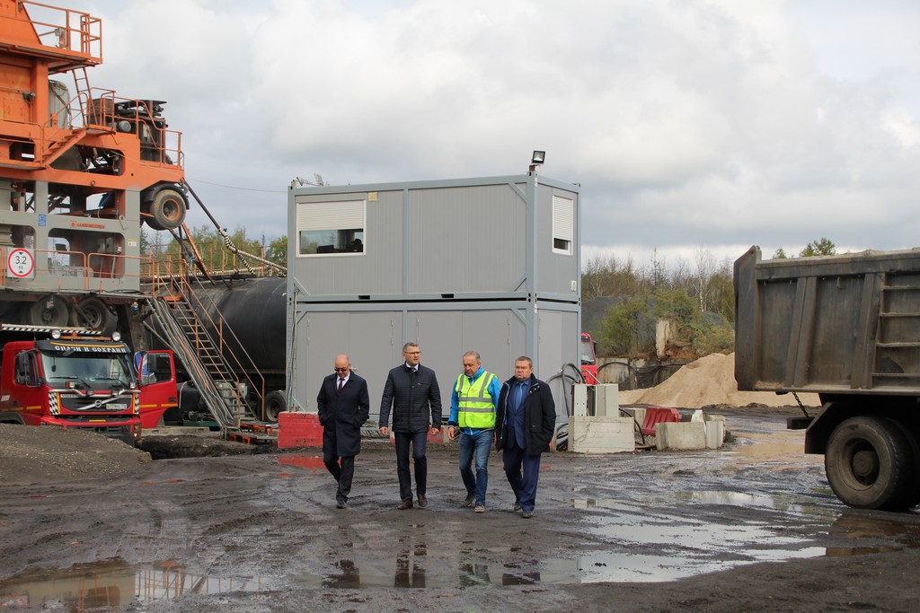 Совещание началось на АБЗ «Спецдорстрой» в районе 2-ое Моховое, где был оборудован строительный комплекс генерального подрядчика. Участники встречи воочию увидили и дробильно-сортировочную установку для производства щебня нужной фракции, и установку для приготовления асфальтогранулобетонной смеси, и асфальтобетонный завод. Нужно отметить, что все установки компьютеризованы, на них работает лишь оператор.