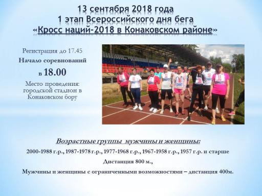 13 сентября на стадионе в Конаковском бору пройдет 1 этап Всероссийского дня бега «Кросс наций - 2018».